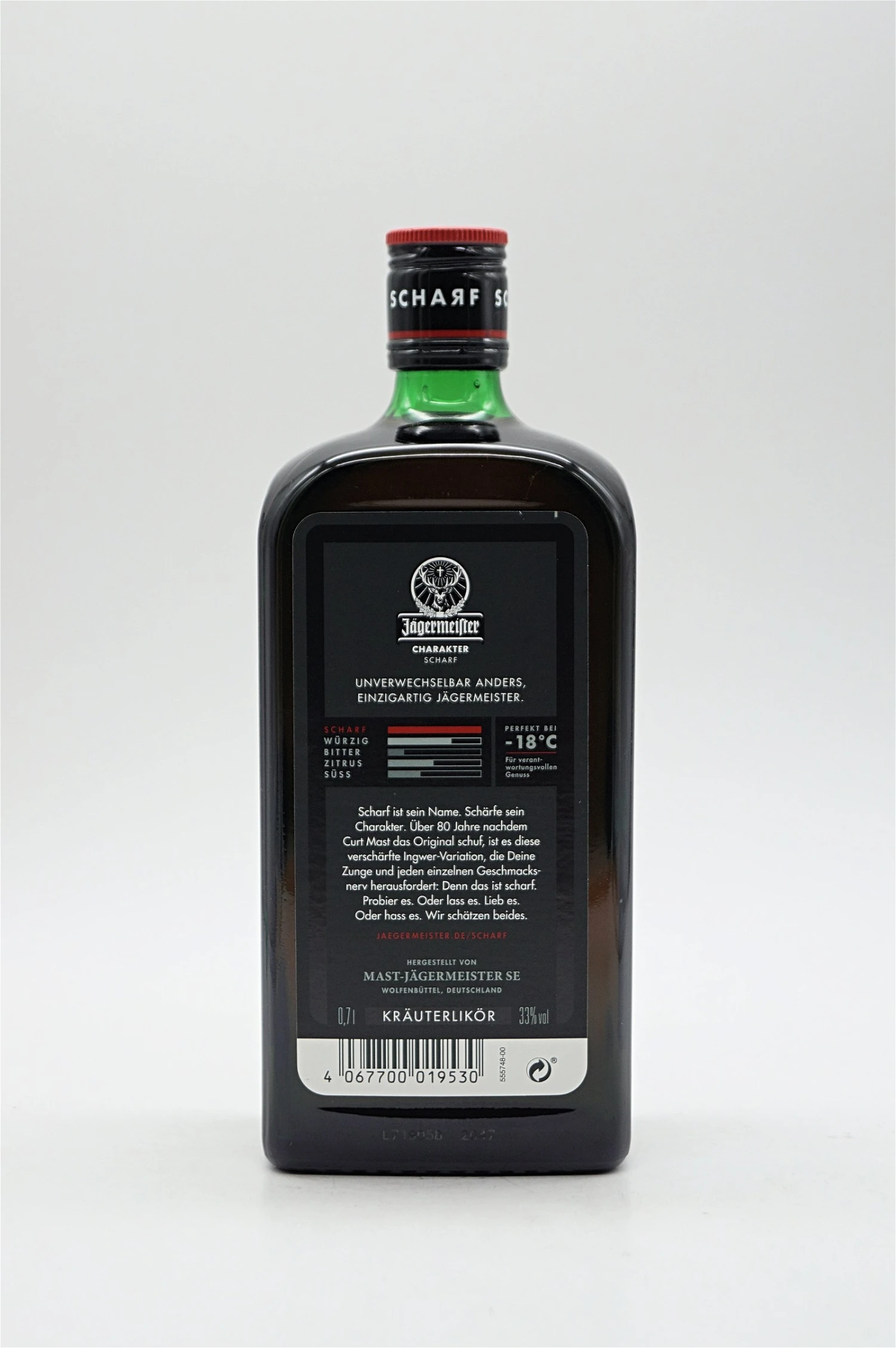 Der Anspruch von Jägermeister: niemals Mittelmaß. Jeden Tag arbeiten sie daran, dem einzig wahren Vorbild, das Curt Mast vor über 80 Jahren geschaffen hat, gerecht zu werden. Angetrieben von ihrer Neugier hat sich Jägermeister auf den Weg gemacht, eine Spirituose zu entwickeln, die ebenso bahnbrechend und einzigartig ist wie der original Jägermeister. Genau so entstand auch die neue Variante Jägermeister: SCHARF.